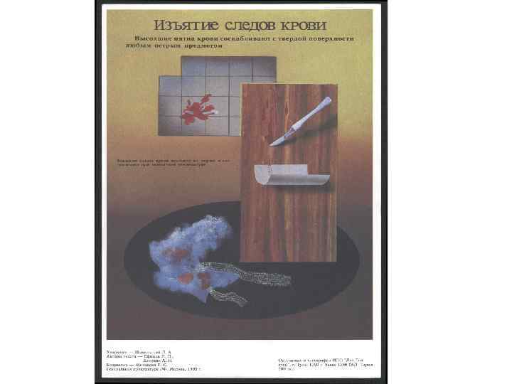 Кто изымает и направляет в соответствующее отделение Бюро СМЭ вещественные доказательства? • Выявление, изъятие, упаковка таких вещественных доказательств, как и образцов, проводятся специалистами в области судебной медицины на месте происшествия, откуда они следователем направляются и доставляются в соответствующие отделы Бюро СМЭ. В этом случае он выносит постановление о назначении судебно-биологической или медико-криминалистической экспертизы. • К таким вещественным доказательствам относят следы крови, спермы, обрывки волос, потожировые отпечатки, реже мочу, кал, слюну, рвотные массы. В зависимости от подозрения на определенное преступление, это могут быть лекарственные средства, химические вещества, неизвестная жидкость, пища и напитки, материалы, использованные в качестве петли при механической асфиксии и т. д. • Особое значение могут иметь предполагаемые орудия травмы, одежда, останки и части трупа человека, любые предметы, вырезки или соскобы с них, пятна, подозрительные на кровь, сперма или другие выделения человека.