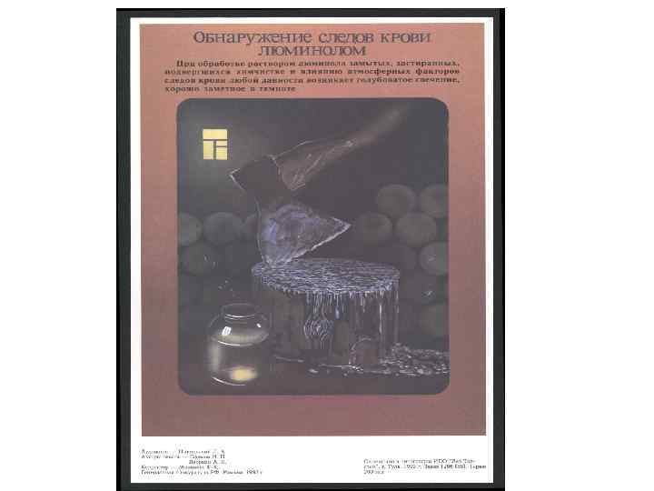 Как изменяется кровь на месте происшествия? Где на предметах-носителях ее лучше искать? • • • Наиболее частым объектом в биологической экспертизе является кровь, кровь следы крови, обнаруживаемые на месте происшествия. Эксперт должен знать — изъята ли кровь из лужи в жидком виде или на марлю с последующим высушиванием, или сделан соскоб из пятен вместе со штукатуркой, либо пятно вырезано из обивки дивана вместе с тканью-носителем. Кровь может направляться из морга, где вскрывался труп, и тогда эксперт должен иметь представление, откуда и как изъята кровь, ибо правильность и место изъятия крови могут иметь значение для заключения. В биологическом отделении нередко кровь находят на одежде. Она может скрываться в обшлагах, карманах, куда заносится окровавленными пальцами, на задней поверхности пуговиц, на отворотах брюк, на подошве обуви и головном уборе, везде, к чему чаще прикасается рука. Другим частым объектом исследования в лаборатории является травмировавшее орудие. И в этом случае, кровь не всегда находится на видном месте, ибо преступник ее успевает смыть или стереть. На ноже она сохраняется в расщелинах между рукояткой и клинком, на топоре — вблизи топорища, в дефектах; на транспортных средствах, в зависимости от механизма его действия при нанесении травмы: на бампере, фарах, передней части капота — при наезде; на бампере колес и нижней поверхности крыльев — при переезде.