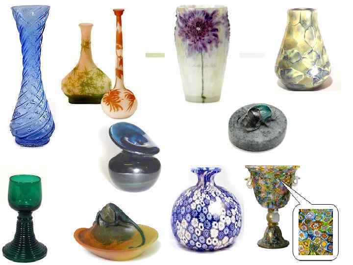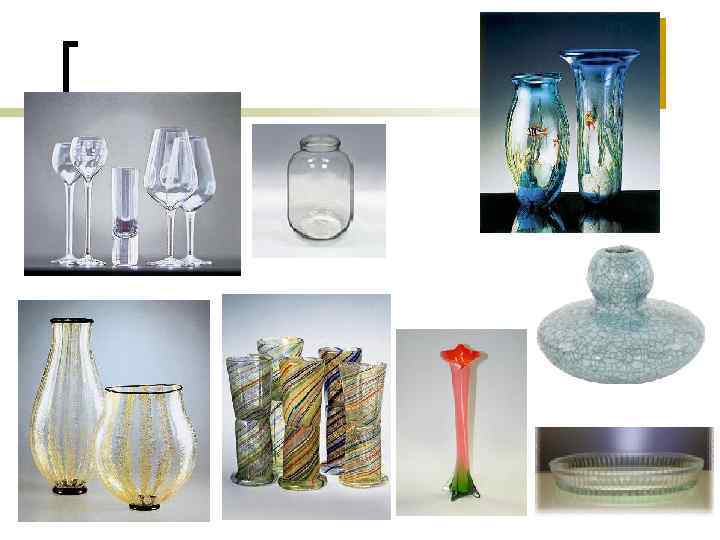 ОСНОВНІ ВИДИ ОЗДОБЛЕННЯ, ЩО НАНОСЯТЬ НА ВИРОБИ В ГАРЯЧОМУ СТАНІ: n n n отримання кольорових виробів, вироби з надкольором із цинксульфідного скла, прикраси філігранню, кракле, написом, під мармур, під малахіт, іризацією, оброблення під валик, прикрашання аерозолями, люстровими фарбами