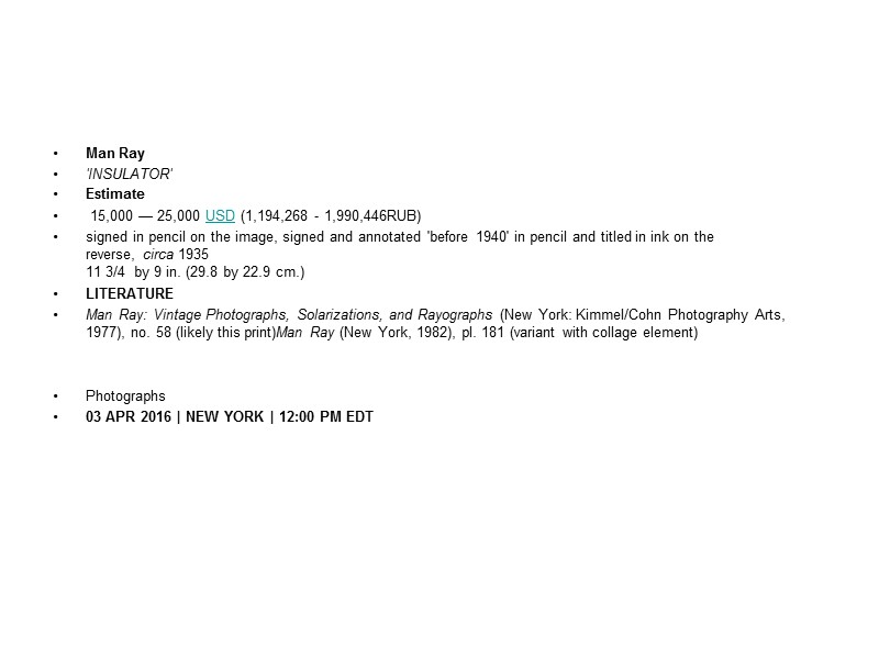 Man Ray 'INSULATOR' Estimate 15,000 — 25,000 USD (1,194,268 - 1,990,446RUB) signed in pencil on the image, signed and annotated 'before 1940' in pencil and titled in ink on the reverse, circa 1935 11 3/4 by 9 in. (29.8 by 22.9 cm.) LITERATURE Man Ray: Vintage Photographs, Solarizations, and Rayographs (New York: Kimmel/Cohn Photography Arts, 1977), no. 58 (likely this print)Man Ray (New York, 1982), pl. 181 (variant with collage element) Photographs 03 APR 2016 | NEW YORK | 12:00 PM EDT