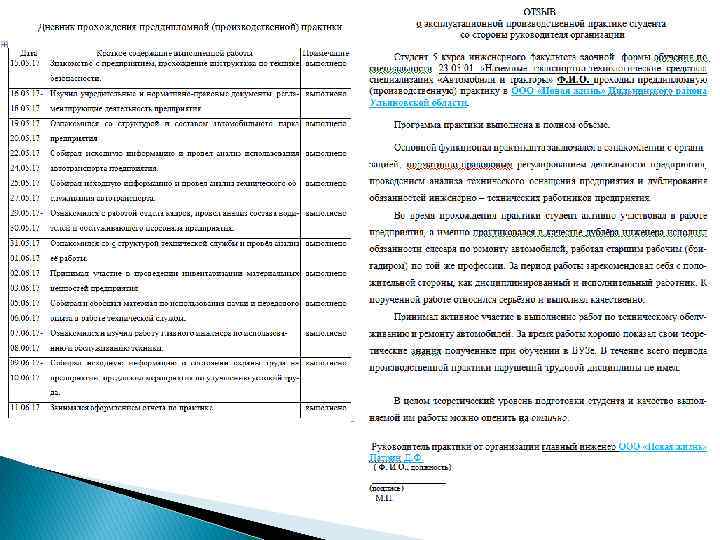 Задачами эксплуатационной производственной практики являются: 1. Ознакомится с общей структурой предприятия. 2. Изучить: производственно-техническую базу предприятия; основы организации производственного и технологического процессов ТО и ремонта автомобилей. обязанности и права специалистов ИТС предприятия; технологическое оборудование, оснастку и инструмент для ТО и ремонта автомобилей; содержание и объем ТО и ремонта автомобилей; методы организации ТО и ремонта автомобилей; систему организации и управления ТО и ремонтом автомобилей; планирование и учет ТО и ремонта автомобилей; систему материально-технического обеспечения предприятия; организацию хранения и учета расхода запасных частей и эксплуатационных материалов на предприятии. Сроки проведения практики: Технологическая эксплуатационная практика – с 09. 10. 2017 по 22. 10. 2017 (2 недели) кафедра ЭММи. ТО к. т. н. , доцент Салахутдинов И. Р. ПППППУ и ОПД: ремонтная – с 23. 10. 2017 по 05. 11. 2017 (2 недели) кафедра Си. М к. т. н. , доцент Карпенко М. А. Технологическая производственная практика – с 25. 09. 2017 по 08. 10. 2017 (6 недель) Ми. ТМ ст. Преподаватель Шамуков Н. И. Место проведения практик: Предприятия сельскохозяйственного, перерабатывающего, транспортного и ремонтного направлений Ульяновской, Самарской области и Республики Татарстан, а так же транспортные, промышленные и сервисные предприятия (любых форм собственности), оснащенные современным технологическим оборудованием, испытательными и измерительными приборами. Оформление отчета по технологической эксплуатационной практике По результатам эксплуатационной производственной практики студент разрабатывает отчет, который должен соответствовать содержанию программы практики. Объем отчета по практике 15 -18 листов формата А 4. Рабочий дневник по практике подшивается к отчету. Отчеты, не отражающие достаточно полно программу практики или оформленные с нарушением требований ГОСТ 2. 105 -95 к защите не допускаются и возвращаются студенту на доработку. По окончанию практики каждый студент защищает отчет по практике перед комиссией кафедры и по итогам его защиты выставляется оценка (отлично, хорошо, удовлетворительно или неудовлетворительно).