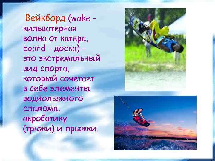 Вейкборд (wake - кильватерная волна от катера, board - доска) это экстремальный вид спорта, который сочетает в себе элементы воднолыжного слалома, акробатику (трюки) и прыжки.