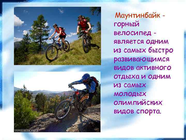 Маунтинбайк горный велосипед является одним из самых быстро развивающимся видов активного отдыха и одним из самых молодых олимпийских видов спорта.