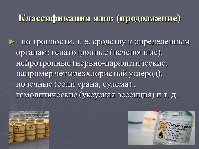 Классификация ядов (продолжение) - по тропности, т. е. сродству к определенным органам: гепатотропные (печеночные), нейротропные (нервно-паралитические, например четыреххлористый углерод), почечные (соли урана, сулема) , гемолитические (уксусная эссенция) и т. д.