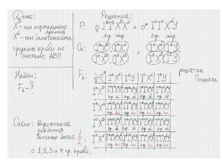 1. Дигибридное скрещивание – один признак сцеплен с полом, другой находится в аутосоме. Пример задачи: Дальтонизм наследуется как рецессивный признак, сцепленный с Х-хромосомой. Мужчина дальтоник со 2 группой крови женится на женщине здоровой с 3 группой крови. Известно, что мать мужа и отец жены имели 1 группу крови, и отец жены был дальтоник. Определите вероятность рождения больных детей в этой семье их возможные группы крови.