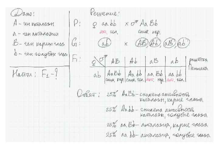 3. Дигибридное скрещивание – один или оба признака наследуются по типу неполного доминирования. Пример: цистинурия, серповидноклеточная анемия, талассемия и некоторые другие гемоглобинопатии. Пример задачи: Акталазия (отсутствие каталазы) обусловлена аутосомным рецессивным геном. У гетерозигот активность каталазы лишь несколько снижена. Ген карих глаз доминирует над геном голубых глаз. Гены обеих пар не сцеплены. Голубоглазая женщина, страдающая акталазией, вступает в брак с мужчиной, имеющим лишь пониженную активность каталазы. Мать мужчины была с голубыми глазами, сам мужчина имеет карие глаза. Определить вероятные генотипы и фенотипы детей в этой семье.