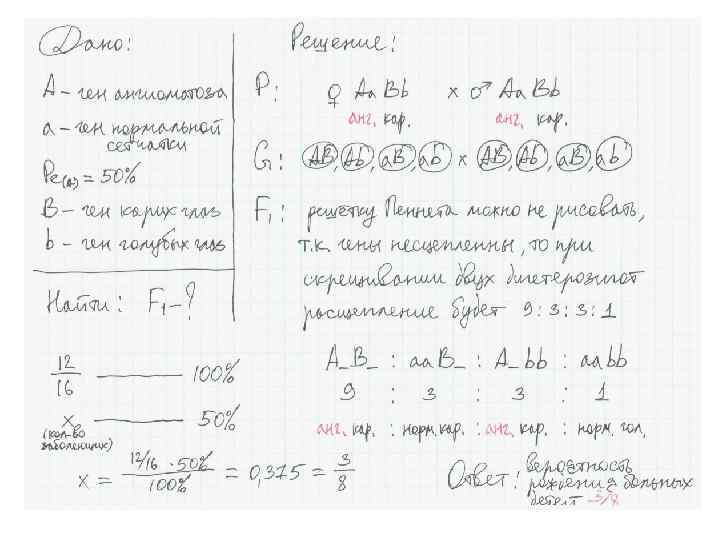 4. Дигибридное скрещивание – один признак сцеплен с полом, другой находится в аутосоме. При этом один или оба признака с неполной пенетрантностью. Пример задачи: Ангиоматоз сетчатой оболочки наследуется как доминантный аутосомный признак с пенетрантностью 50%. Карий цвет глаз доминирует над голубым и определяется аутосомным геном. Какова вероятность рождения больных детей в семье, где оба родителя дигетерозиготны?