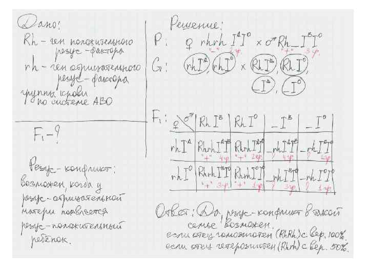6. Задачи на определение резус-конфликта в семье. Пример задачи: Жена резус-отрицательна со 2 группой крови, муж – резус положителен с 3 группой крови. Известно, что мать мужа и отец жены имели 1 группу крови. Возможен ли в такой семье резус-конфликт? Если да, то с какой вероятностью?