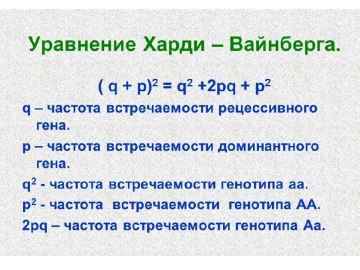 Задачи по популяционной генетике, на закон Харди-Вайнберга Типы задач: 1. Признак аутосомно-рецессивный. 2. Признак аутосомно-доминантный. 3. Два признака, один из которых невозможно рассчитать по закону Харди-Вайнберга. 4. Признак с неполной пенетрантностью. 5. Частота представлена десятичной дробью или выражена в процентах.