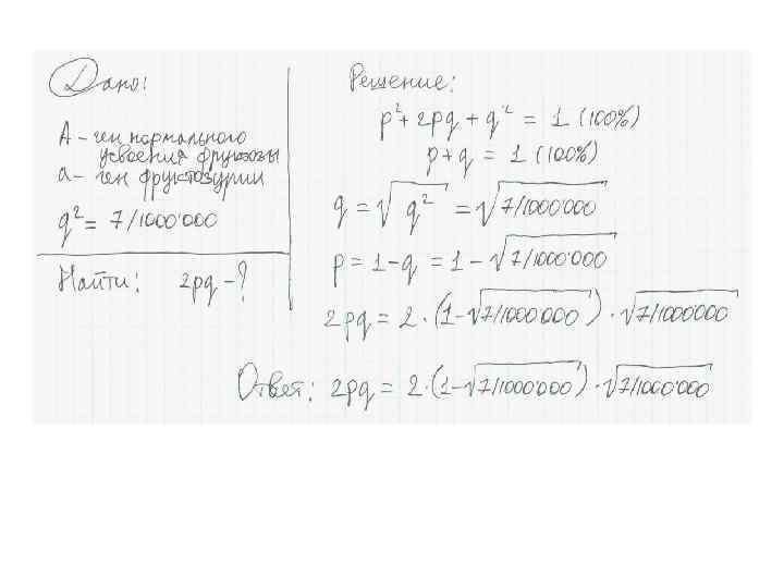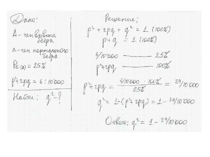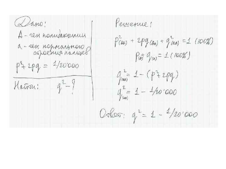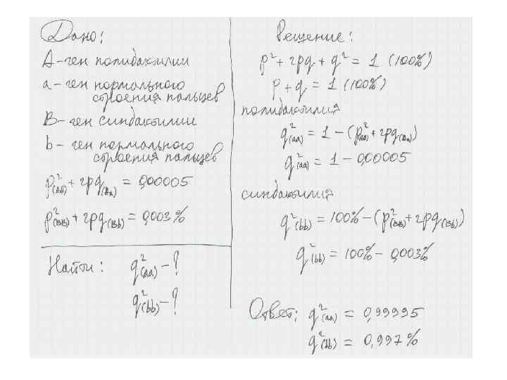 5. Частота представлена десятичной дробью или выражена в процентах. Пример задачи: Полидактилия – заболевание наследуется аутосомнодоминантно и встречается с частотой 0, 00005. Синдактилия – заболевание наследуется аутосомнодоминантно и встречается с частотой 0, 003%. Определите число рецессивных гомозигот в популяции для каждого заболевания.