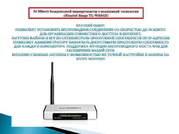 Применение 54 Мбит/с беспроводной маршрутизатор TL-WR 542 G с поддержкой технологии e. Xtended Range объединяет в себе функции брандмауэра, NAT-маршрутизатора и беспроводной точки доступа. TLWR 542 G предназначен для использования в малых и домашних офисах; он позволит вам создать высокопродуктивную беспроводную сеть для организации совместного доступа в Интернет, просмотра видео высокой четкости и онлайн-игр. Помимо этого, TL-WR 542 G поддерживает функцию беспроводного моста WDS, благодаря чему вы сможете расширить вашу сеть и сделать возможным прием сигнала в разных комнатах или офисах. Установка устройства тоже не составляет проблем: с помощью программы Easy Setup Assistant (Помощник по быстрой настройке) вы сможете в пошаговом режиме выполнить установку маршрутизатора и легко настроить беспроводную сеть и ее защиту.