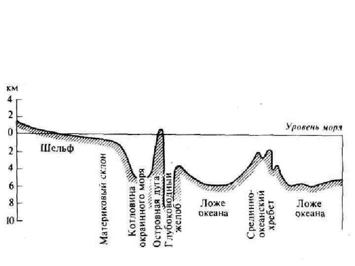 • Шельф - мелководная часть подводной окраины материков и островов, имеющая относительно выровненную поверхность и незначительные уклоны • Материковый (континентальный) склон – переходная зона от подводной окраины материка к ложу Мирового океана, выражен в виде относительно крутого уступа, который опускается от бровки шельфа до глубины 2000 -2500, иногда 3000 м. • Ложе Мирового океана - крупнейший элемент рельефа Земли, занимающий большую часть дна океана и характеризующийся океанским типом земной коры • Турбидитные потоки (мутьевые потоки) –придонные течения, характеризуемые повышенной плотностью. Возникают на склоне морского дна, когда нарушается равновесие больших масс рыхлого донного осадка и образуются подводные оползни.