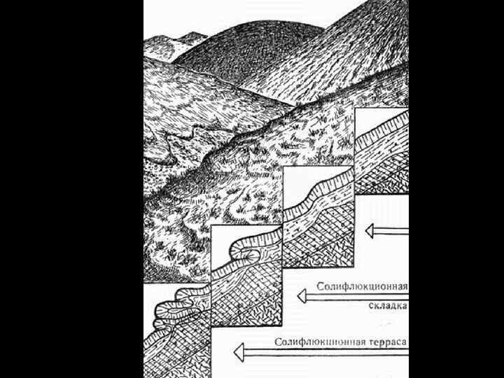 По происхождению мерзлотные формы делятся на: • формы рельефа, созданные процессами солифлюкции; • формы рельефа, обусловленные термокарстовыми явлениями; • формы рельефа, связанные с образованием морозобойных трещин