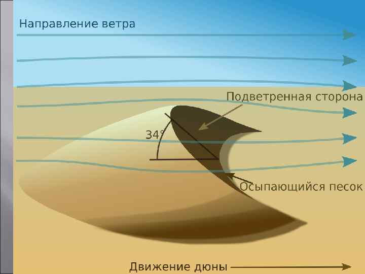 Дюны-песчаные холмы на низменных берегах морей, озер и рек, нанесенные ветрами, дующими в направлении берега