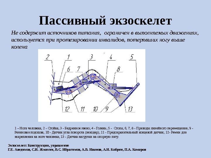 Пассивный экзоскелет 1 – Нога человека; 2 — Стойка; 3 — Бедренное звено; 4 — Голень; 5 — Стопа; 6, 7, 8 — Приводы линейного перемещения; 9 — Резиновая подошва; 10 — Датчик угла поворота (энкодер); 11 — Предохранительный концевой датчик; 12 — Ремни для закрепления на ноге человека; 13 — Датчик нагрузки на опорную пяту. Не содержит источников питания, ограничен в выполняемых движениях, используется при протезировании инвалидов, потерявших ногу выше колена Экзоскелет: Конструкция, управление Г. Е. Аведиков, С. И. Жмакин, В. С. Ибрагимов, А. В. Иванов, А. И. Кобрин, П. А. Комаров