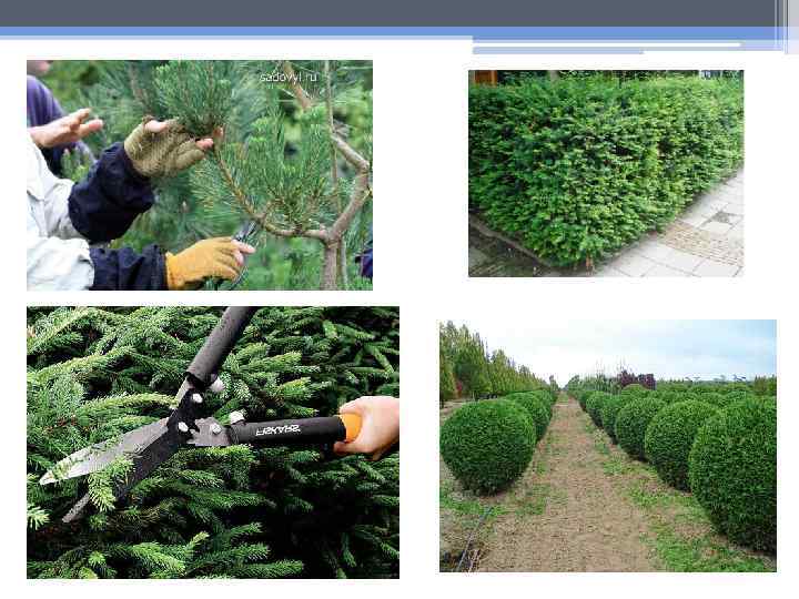 Обрезка • Здоровым хвойным растениям ежегодная обрезка практически не требуется, если не считать санитарной, когда удаляются усохшие, поврежденные, сломанные ветки. Но если вы хотите сформировать из хвойных культур живую изгородь или придать им определенную форму, то без обрезки не обойтись. • Формировать хвойные растения можно не ранее чем через год после посадки или пересадки. • Стричь хвойные можно с ранней весны до поздней осени. • За одну стрижку можно убирать не более 1/3 зеленой массы.
