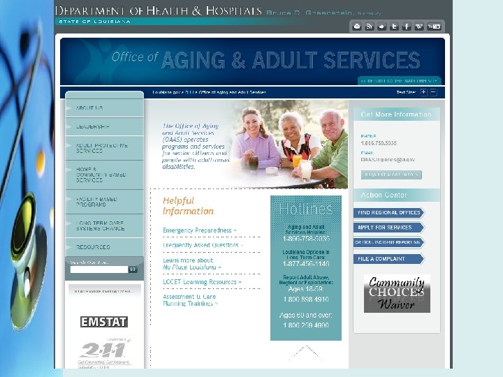DHH & APS • The Office of Aging and Adult Services (OAAS), Adult Protective Services (APS) DHH as the agency responsible for carrying out the mandate of 14: 403. 2 with regard to adults with disabilities ages 18 -59 • (225) 342 -9057 or (800) 898 -4910 • Fax (225) 342 -9069 • http: //www. dhh. state. la. us/offices/Default. asp? ID=95&Print =1