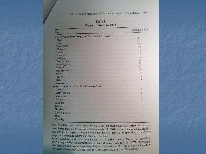 Effects cont’ n Not neutral n Large states --can win just by winning the 12 largest + 2 more n CA has 1/5 of all EC votes needed Small states n Competitive States, and especially dependable and cohesive voting blocks within those states n Goux and Hopkins 2008 n Charnock, Mc. Cann and Tenpas 2009 n