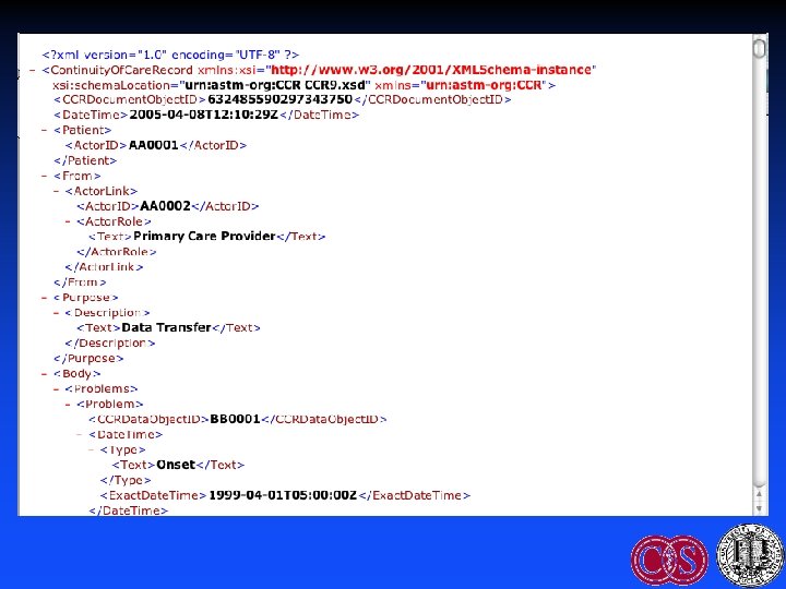 Improving Adoption: CCR • ASTM E 31 WK 4363 (2004). Coalition = AAP, AAFP, HIMSS, ACP, AMA, etc • Defines the core data elements & content of the patient record in XML – Read/write standard data elements: Snapshot of the record – Therefore increases interoperability • Uses: Record sharing, e. Rx (allergies, medications), certification • Components: standard content; elements spreadsheet; implementation guide; XML schema