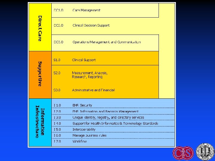 HL 7 EHR/CDSS Standards Efforts • Components – Data model: RIM – (Standard vocabularies) – CDA: documents – Access: CCOW • Knowledge representation – Common Expression Language (“GELLO”) – Arden Syntax – Clinical guidelines: GEM vs GLIF 3 vs ? – Info. Button – Order Set • EHR Functional Model and Standard