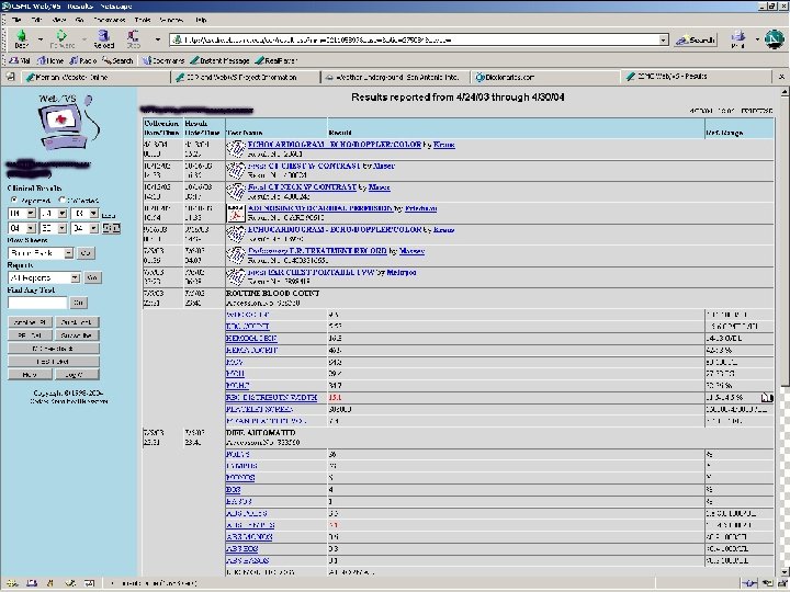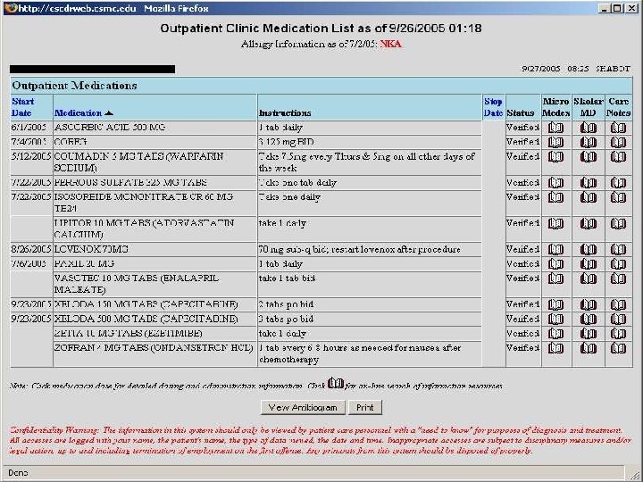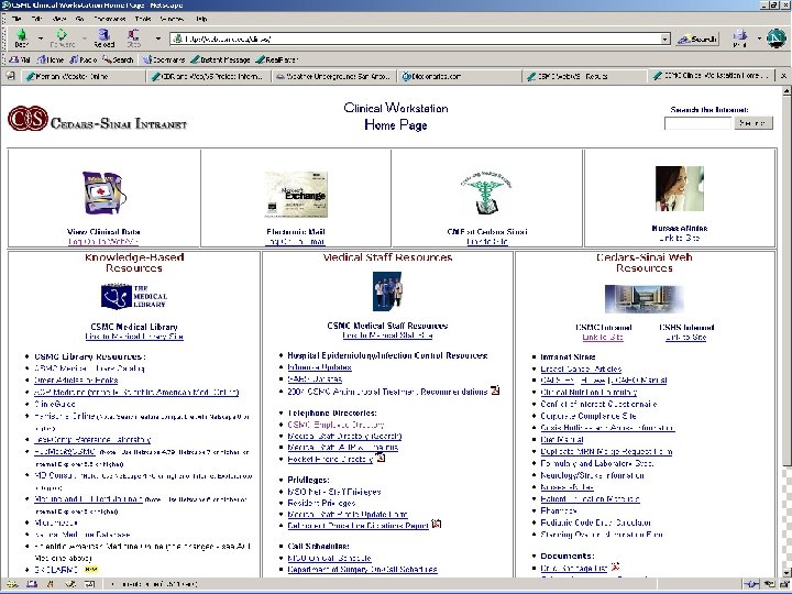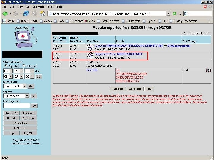 EHR at CSMC • Components – CDR – HL 7 communication interfaces (lab, imaging, etc) – Vocabulary server (CHARLIE using CTS) • Accessing data: Electronic health records – Web/VS – Logician • Knowledge sources – Electronic textbooks – Bibliographic access – Info. Buttons – Order Sets