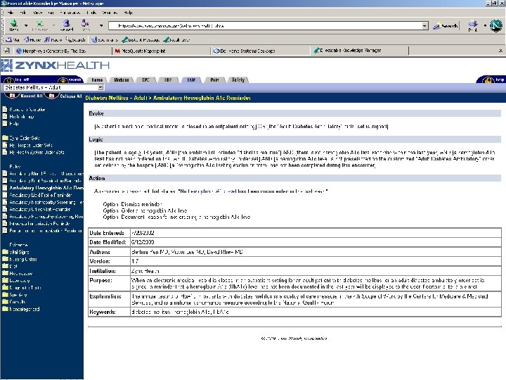 Guideline Model: GEM • Guideline Elements Model = Current ASTM standard • Mark up of a narrative guideline into structured format using XML – Not procedural programming – Tool = GEM Cutter • Resulting structure might be used to translate to executable version Shiffman RN, Agrawal A, Deshpande AM, Gershkovich P. An approach to guideline implementation with GEM. Proc Medinfo 2001; 271 -275.