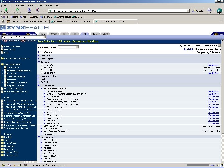 Order Set Standard • Order Set: Document containing a group of orders for specific care episodes (disease states or presentations) – Examples: Admission for chest pain; communityacquired pneumonia • Features – Checklist: Remind clinicians what to do – Advice: Provide therapeutic options, dosing, etc • Goals: Allow selection of parts or all of order set within a CPOE system. Facilitate sharing. • Current status (HL 7): Under development