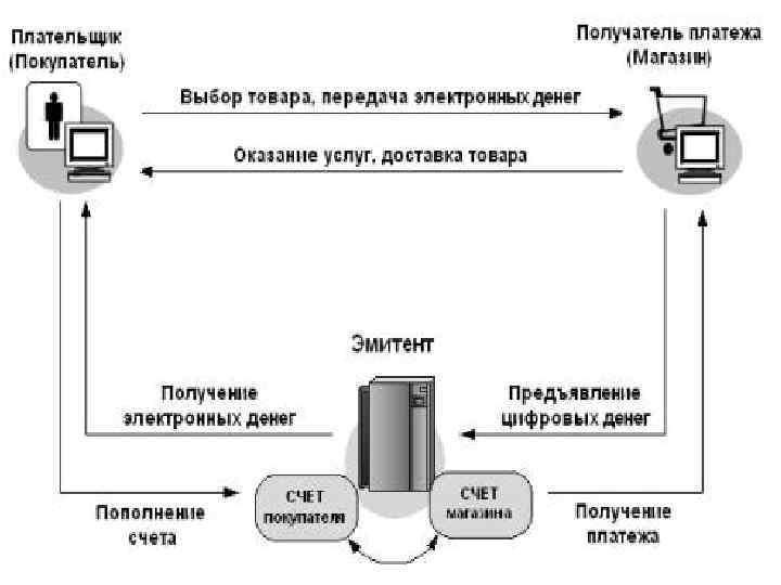 Электронные деньги 1. Покупатель заранее обменивает реальные деньги на электронные. Хранение наличности у клиента : 1. на жестком диске компьютера; 2. на смарт-картах. 2. Покупатель перечисляет на сервер продавца электронные деньги за покупку. 3. Деньги предъявляются эмитенту, который проверяет их подлинность. 4. В случае подлинности электронных купюр счет продавца увеличивается на сумму покупки, а счет покупателя уменьшается на эту же сумму и ему отгружается товар или оказывается услуга.