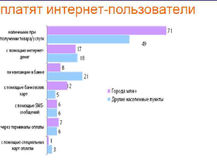 Исследование российского рынка платежных систем Электронными деньгами пользуются 3, 9 млн. чел. в возрасте от 18 до 45 лет n 1 -место пластиковые карты (35%) n 2 -место электронные деньги (27%) n 3 -место интернет-банкинг (17%) n