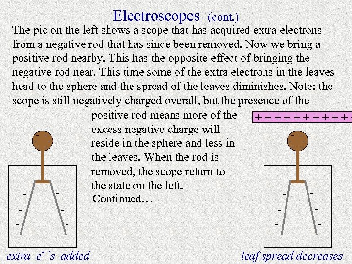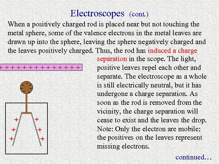 Electroscopes (cont. ) When a positively charged rod is placed near but not touching the metal sphere, some of the valence electrons in the metal leaves are drawn up into the sphere, leaving the sphere negatively charged and the leaves positively charged. Thus, the rod has induced a charge separation in the scope. The light, +++++++ positive leaves repel each other and separate. The electroscope as a whole - -is still electrically neutral, but it has -- undergone a charge separation. As soon as the rod is removed from the vicinity, the charge separation will + + cease to exist and the leaves the drop. Note: Only the electron are mobile; + + the positives on the leaves represent + + missing electrons. continued…