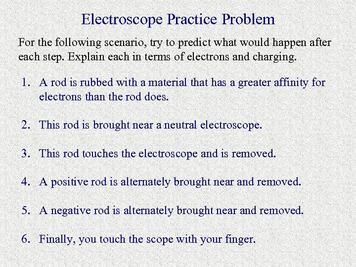 Electroscope Practice Problem For the following scenario, try to predict what would happen after each step. Explain each in terms of electrons and charging. 1. A rod is rubbed with a material that has a greater affinity for electrons than the rod does. 2. This rod is brought near a neutral electroscope. 3. This rod touches the electroscope and is removed. 4. A positive rod is alternately brought near and removed. 5. A negative rod is alternately brought near and removed. 6. Finally, you touch the scope with your finger.