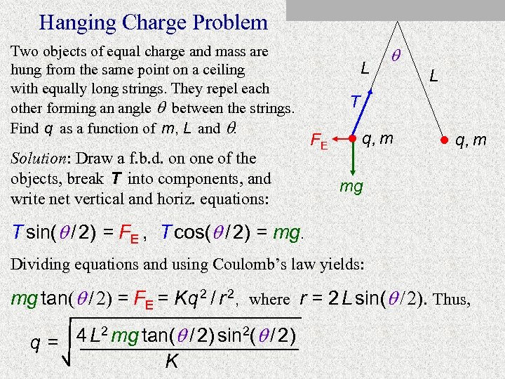 Hanging Charge Problem Two objects of equal charge and mass are hung from the same point on a ceiling with equally long strings. They repel each other forming an angle between the strings. Find q as a function of m, L and . Solution: Draw a f. b. d. on one of the objects, break T into components, and write net vertical and horiz. equations: L L T FE q, m mg T sin( / 2) = FE , T cos( / 2) = mg. Dividing equations and using Coulomb’s law yields: mg tan( / 2) = FE = Kq 2 / r 2, where r = 2 L sin( / 2). Thus, 4 L 2 mg tan( / 2) sin 2( / 2) q= K