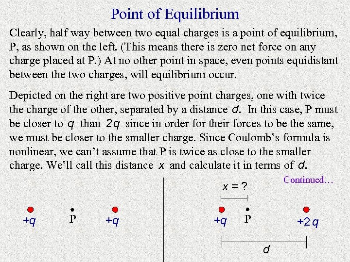 Point of Equilibrium Clearly, half way between two equal charges is a point of equilibrium, P, as shown on the left. (This means there is zero net force on any charge placed at P. ) At no other point in space, even points equidistant between the two charges, will equilibrium occur. Depicted on the right are two positive point charges, one with twice the charge of the other, separated by a distance d. In this case, P must be closer to q than 2 q since in order for their forces to be the same, we must be closer to the smaller charge. Since Coulomb’s formula is nonlinear, we can’t assume that P is twice as close to the smaller charge. We’ll call this distance x and calculate it in terms of d. Continued… x=? +q P +q +q P +2 q d