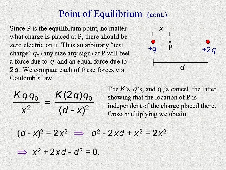 Point of Equilibrium Since P is the equilibrium point, no matter what charge is placed at P, there should be zero electric on it. Thus an arbitrary “test charge” q 0 (any size any sign) at P will feel a force due to q and an equal force due to 2 q. We compute each of these forces via Coulomb’s law: K q q 0 K (2 q) q 0 = 2 x (d - x)2 (cont. ) x +q +2 q d The K’s, q’s, and q 0’s cancel, the latter showing that the location of P is independent of the charge placed there. Cross multiplying we obtain: (d - x)2 = 2 x 2 d 2 - 2 x d + x 2 = 2 x 2 + 2 x d - d 2 = 0. P