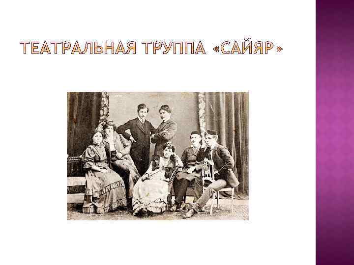 22 декабря 1906 г. – первое представление татарской труппы «Сайяр» «Жалкое дитя» В составе труппы: Г. Кариев, С. Гизатуллина -Волжская, Болгарская и др. Г. Камал – «отец» татарского театра Первые пьесы Г. Камала - «вольный перевод» русской и зарубежной классики Пьеса «Первый театр» Театр родился и развивался при большом сопротивлении религиозных фанатиков и схоластов Центр передового татарского искусства
