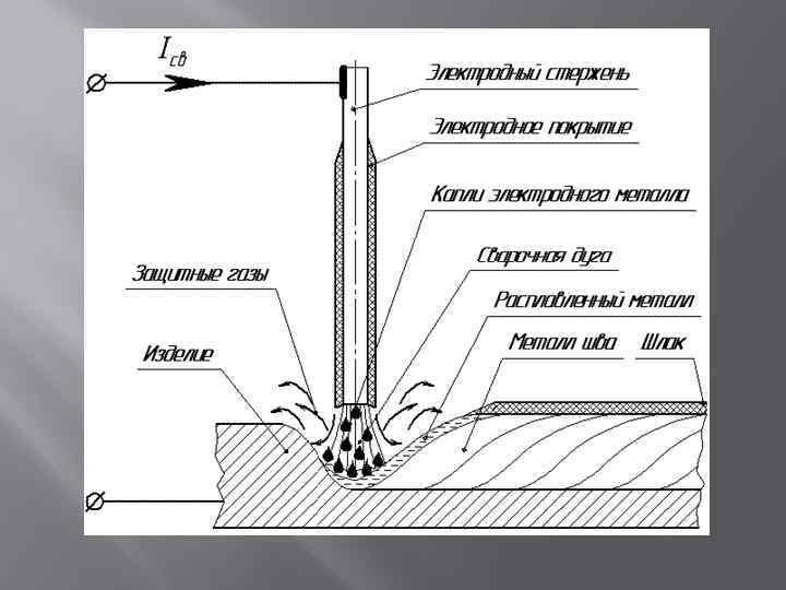 Покрытым (плавящимся металлическим) электродом 1 - Прямой сварочный привод 2 – Электрододержатель 3 – Покрытый электрод 4 – Металлический стержень электрода 5 - Покрытие электрода 6 – Жидкие капли расплавленного электрода 7 – Электрическая сварочная дуга 8 – Защитный газ 9 – Жидкий шлак (шлаковая ванна) 10 – Шлаковая корка 11 - Проплавленный металл 12 – Основной металл 13 – Сварочная ванна 14 – Обратный сварочный провод