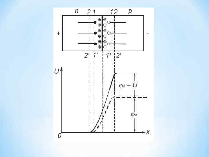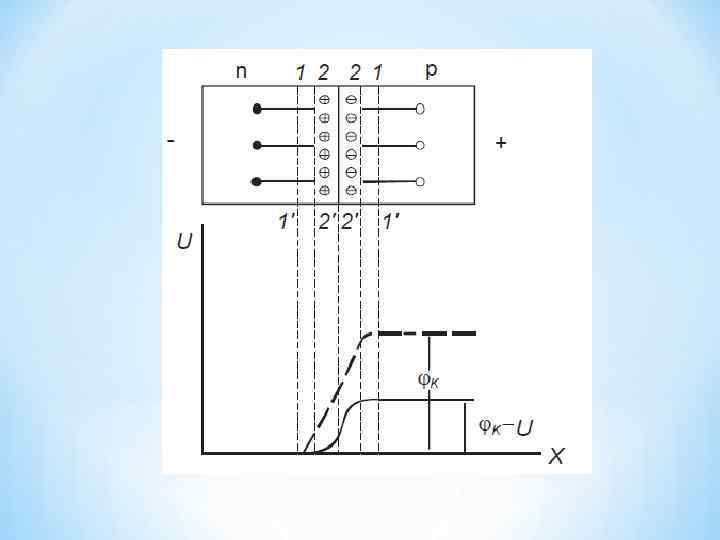На границе p- и n-областей создаётся слой, обеднённый подвижными носителями. В приконтактной области n-типа появляется нескомпенсированный заряд положительных ионов, а в дырочной области – нескомпенсированный заряд отрицательных ионов примесей. Таким образом, электронный полупроводник заряжается положительно, а дырочный – отрицательно.