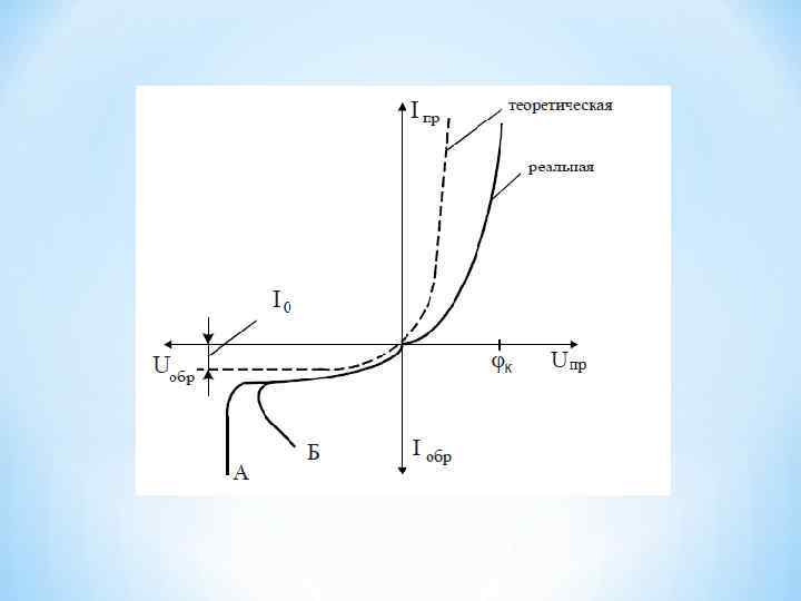 При T=300 K величина e/k. T≈40 B-1, поэтому при относительно небольшом прямом напряжении ток через переход резко воз-растает. При подаче обратного напряжения ток, изменив направление, быстро достигает значения , а далее остается постоянным независимо от величины приложенного напряжения. Реальная характеристика p-n-перехода отличается от теоретической. Эти различия обусловлены термогенерацией носителей в запирающем слое перехода, падением напряжения на сопротивлениях областей полу-проводника, а также явлением пробоя при обратном напряжении.