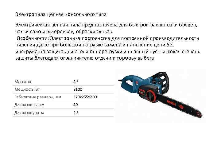 Электропила цепная консольного типа Электрическая цепная пила предназначена для быстрой распиловки бревен, валки садовых деревьев, обрезки сучьев. Особенности: Электроника постоянства для постоянной производительности пиления даже при большой нагрузке замена и натяжение цепи без инструмента защита двигателя от перегрузки и плавный пуск высокая степень защиты благодаря ограничителю отдачи и тормозу выбега Масса, кг 4. 8 Мощность, Вт 2100 Габаритные размеры, мм 820 x 255 x 200 Длина шины, см 40 Длина шнура, м 2. 5