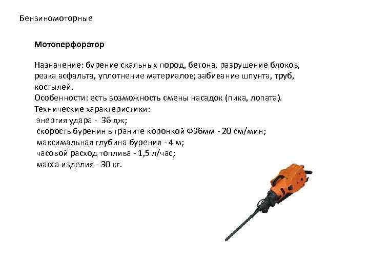 Бензиномоторные Мотоперфоратор Назначение: бурение скальных пород, бетона, разрушение блоков, резка асфальта, уплотнение материалов; забивание шпунта, труб, костылей. Особенности: есть возможность смены насадок (пика, лопата). Технические характеристики: энергия удара - 36 дж; скорость бурения в граните коронкой Ф 36 мм - 20 см/мин; максимальная глубина бурения - 4 м; часовой расход топлива - 1, 5 л/час; масса изделия - 30 кг.