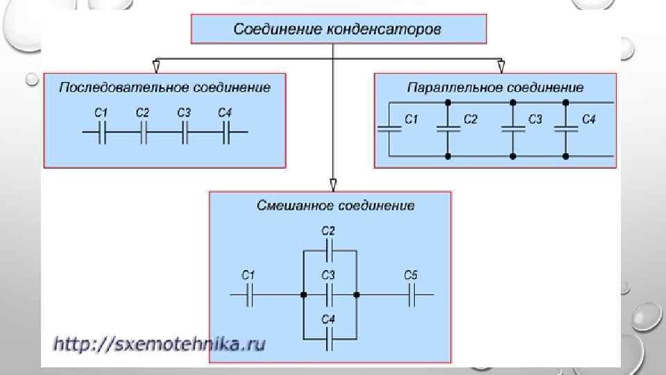 СОЕДИНЕНИЕ КОНДЕНСАТОРОВ В ЭЛЕКТРИЧЕСКИХ ЦЕПЯХ ПРИМЕНЯЮТСЯ РАЗЛИЧНЫЕ СПОСОБЫ СОЕДИНЕНИЯ КОНДЕНСАТОРОВ. СОЕДИНЕНИЕ КОНДЕНСАТОРОВ МОЖЕТ ПРОИЗВОДИТЬСЯ: ПОСЛЕДОВАТЕЛЬНО, ПАРАЛЛЕЛЬНО И ПОСЛЕДОВАТЕЛЬНО ПАРАЛЛЕЛЬНО (ПОСЛЕДНЕЕ ИНОГДА НАЗЫВАЮТ СМЕШАННОЕ СОЕДИНЕНИЕ КОНДЕНСАТОРОВ). СУЩЕСТВУЮЩИЕ ВИДЫ СОЕДИНЕНИЯ КОНДЕНСАТОРОВ ПОКАЗАНЫ НА РИСУНКЕ 1.