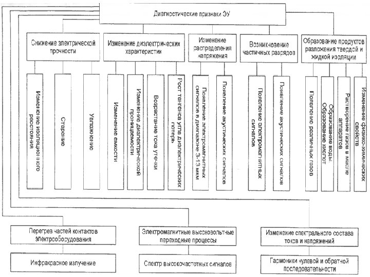 2. Диагностические признаки ЭО. В процессе длительной эксплуатации ЭУ восстанавливаемые не восстанавливаемые элементы ЭО подвергаются старению (деструкции), что приводит к изменению ряда физических свойств или признаков. Рассмотрим взаимосвязь основных диагностических признаков и дефектов, возникающих в элементах ЭО.