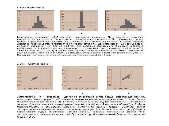 Статистический анализ RRNN – средняя длительность интервалов R-R и обратная величина этого показателя - средняя ЧСС. Показатель RRNN отражает конечный результат многочисленных регуляторных влияний на синусовый ритм сложившегося баланса между парасимпатическим и симпатическим отделами вегетативной нервной системы; SDNN (standart deviation of the NN interval) – стандартное отклонение величин нормальных RR-интервалов. SDNN является интегральным показателем, характеризующим вариабельность ритма сердца в целом, и зависит от влияния на синусовый узел симпатического и парасимпатического отделов ВНС. Увеличение или уменьшение этого показателя свидетельствует о смещении вегетативного баланса в сторону преобладания одного из отделов ВНС. CV = SDNN/RRNNx 100% – коэффициент вариации. По физиологическому смыслу этот показатель не отличается от SDNN, но при анализе ВРС позволяет учитывать влияние ЧСС. RMSSD – стандартное отклонение разностей RR-интервалов от их средней арифметической. NN 50 – число пар последовательных RR-интервалов, различающихся более чем на 50 мс. p. NN 50 – их процент от числа всех анализируемых кардиоинтервалов. Анализ гистограммы Мода (Мо) – это наиболее часто встречающееся значение RR. Она указывает на доминирующий уровень функционирования синусного узла. При симпатотонии мода минимальна, при ваготонии - максимальна. В норме значение моды колеблется от 0, 7 до 0, 9. Амплитуда моды (АМо) – отношение количества RR-интервалов со значениями, равными Мо к общему количеству RR-интервалов в процентах. Данный показатель отражает степень ригидности ритма. Его нормальные значения равны 30 -50%. Увеличение АМо будет свидетельствовать о преобладании симпатических влияний на синусный узел и значительной ригидности ритма. При ваготонии данный показатель имеет тенденцию к уменьшению. Вариационный размах (ВР) – вычисляется как разница между максимальным и минимальным значениями RR-интервалов (ширина основания гистограммы). ВР рассматривают как парасимпатический показатель. Чем он выше, тем сильнее выражено влияния вагуса на ритм сердца. Нормальные значения ВР – от 0, 15 до 0, 45. HRV-index – триангулярный индекс ВРС, вычисляется по гистограмме, построенной с интервалом в 8 мс, путём деления общего числа анализируемых RR-интервалов на частоту встречаемости RR, соответствующего моде.