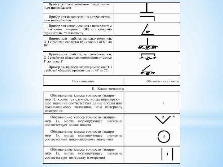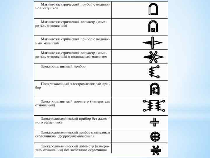 По принципу действия: электромагнитные магнитоэлектрические электродинамические ферродинамические электростатические и др. По устойчивости к механическим воздействиям: с повышенной прочностью тряскопрочные ТП вибропрочные ВП не чувствительные к тряске – тряскоустойчивые ТН не чувствительные к вибрации – вибрационноустойчивые ВН ударопрочные – УП Маркировка: Электроизмерительные приборы исключительно разнообразны по назначению, конструктивному оформлению, принципу действия и техническим характеристикам. Чтобы легко получить необходимую и достаточную характеристику каждого электроизмерительного прибора, ГОСТом установлена специальная система их маркировки. Согласно этому ГОСТу на лицевой стороне прибора, обычно на шкале, при помощи условных обозначений указаны: единица измеряемой величины (А, V, W ит. д. ); класс точности прибора; ГОСТ, по которому прибор изготовлен; род тока и число фаз; система прибора; категория защищенности прибора от влияния внешних магнитных или электрических полей; группа прибора по условиям эксплуатации; рабочее положение прибора; испытательное напряжение прочности электрической изоляции токоведущих частей прибора относительно его корпуса; положение прибора относительно земного магнитного поля, если это влияет на показание прибора; номинальная частота, если она отличается от 50 Гц; тип (шифр) прибора; год выпуска и заводской номер прибора; товарный знак (фабричная марка) завода изготовителя.