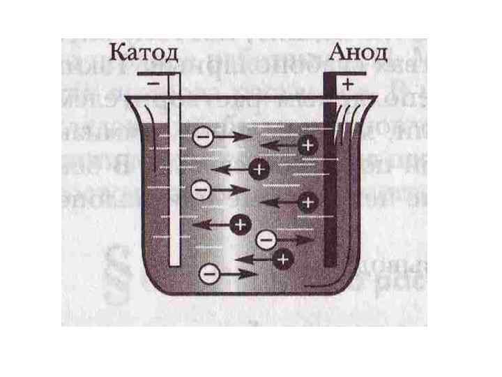 Электролиты в растворах или расплавах распадаются на ионы и поэтому проводят электрический ток. Молекула электролита распадается на + катион и - анион. Под действием эл. тока катионы движутся к катоду (-), анионы к аноду (+).