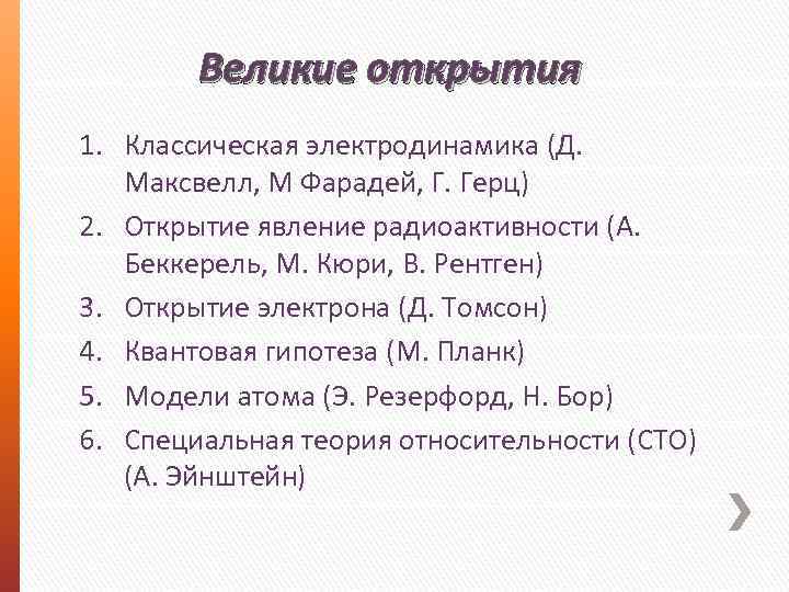 Великие открытия 1. Классическая электродинамика (Д. Максвелл, М Фарадей, Г. Герц) 2. Открытие явление радиоактивности (А. Беккерель, М. Кюри, В. Рентген) 3. Открытие электрона (Д. Томсон) 4. Квантовая гипотеза (М. Планк) 5. Модели атома (Э. Резерфорд, Н. Бор) 6. Специальная теория относительности (СТО) (А. Эйнштейн)