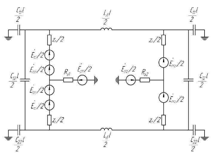 На данной схеме показана симметричная система сопротивлений и ЭДС в начале и конце линии. Показана несимметрия емкостных параметров проводников. Эта несимметрия не может быть устранена ни какими техническими мерами. Любое нарушение симметрии параметров приводит к появлению противофазного напряжения на входе приемника, при действии любого источника синфазной помехи. Количественно этот эффект может быть выражен следующими показателями: 1. Коэффициент преобразования синфазного сигнала в противофазный. , при остальных источниках равных нулю. 2. Коэффициент синфазно-противофазного затухания. Данная схема не учитывает волновые эффекты при прохождении сигнала вдоль двухпроводной системы и может применяться, если l<λ/4. А более строго эта схема может применяться если l<λ/(π√ 8). Для учета волновых эффектов можно применять многопролетную схему замещения.
