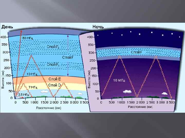 Средние волны К средним волнам относятся радиоволны длиной от 100 до 1000 м (частоты 3— 0, 3 МГц). Средние волны используются главным образом для вещания. Они могут распространяться как земные и как ионосферные волны Средние волны испытывают значительное поглощение в полупроводящей поверхности Земли, дальность распространения земной волны ограничена расстоянием 500— 700 км. На большие расстояния радиоволны распространяются ионосферной волной В ночное время средние волны распространяются путем отражения от слоя ионосферы, электронная плотность которого оказывается достаточной для этого. В дневные часы на пути распространения волны расположен слой, чрезвычайно сильно поглощающий средние волны. Поэтому при обычных мощностях передатчиков напряженность электрического поля недостаточна для приема, и в дневные часы распространение средних волн происходит практически только земной волной на сравнительно небольшие расстояния (порядка 1000 км). В диапазоне средних волн более длинные волны испытывают меньшее поглощение, и напряженность электрического поля ионосферной волны больше на более длинных волнах. Поглощение увеличивается в летние месяцы и уменьшается в зимние месяцы. Ионосферные возмущения не влияют на распространение средних волн, так как слой мало нарушается во время ионосферно-магнитных бурь.
