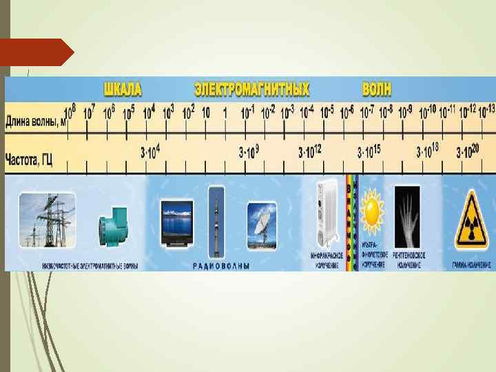 Шкала электромагнитных волн Вид им ы й свет У л ь т р а фи о ле т о в о е и з л у че н и е Р е нт г е но в ское и з л у че н и е Гамма излучение Инфр акрас ное излуче ние Н и з к о ча с т о т н ы е и з л у че н и я Р ад и о в о л н ы СВЧ излучения