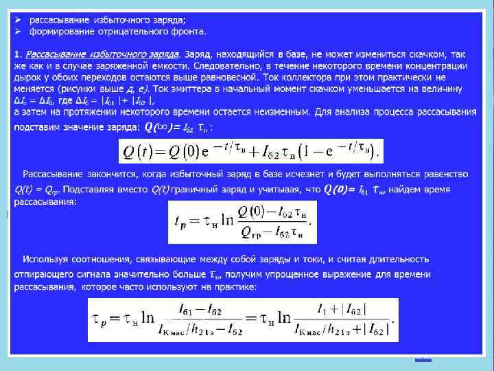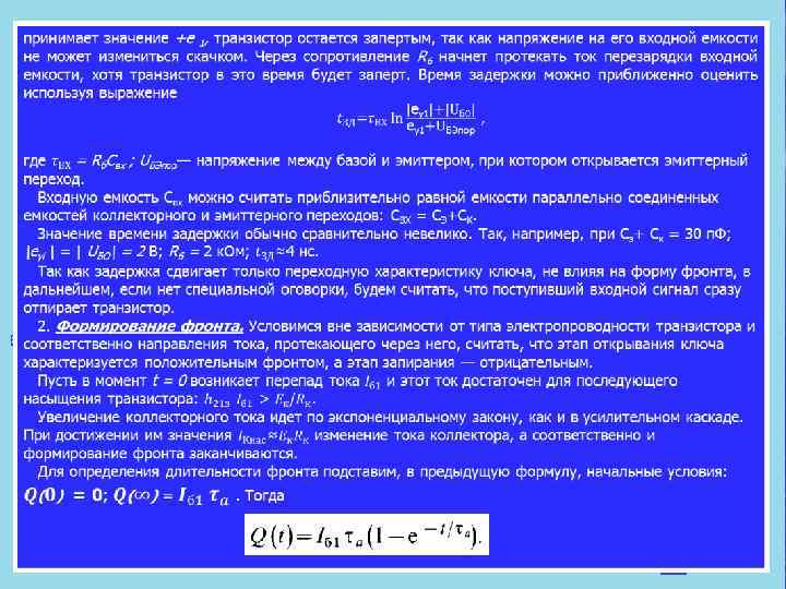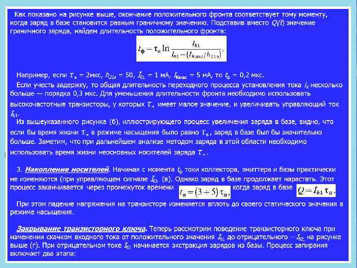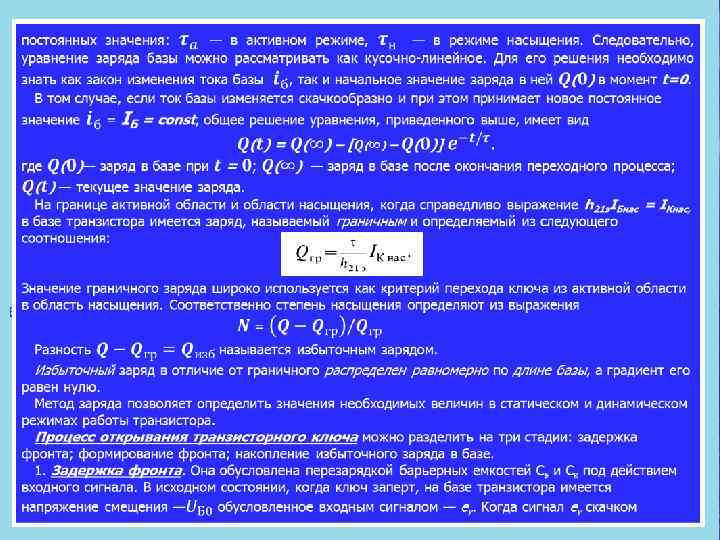 В ряде случаев при большом запирающем сигнале можно использовать еще более упрощенное выражение: где N—степень насыщения. Время рассасывания и связанная с ним задержка уменьша ются с увеличением запирающего сигнала и убыванием степени насыщения. Поэтому большие отпирающие токи /б 1, которые выгодны с точки зрения длительности положительного фронта, нежелательны с точки зрения запирания ключа. После рас сасывания избыточного заряда в базе транзистор оказывается в активной области. 2. Формирование отрицательного фронта. Рассасывание из быточного заряда может произойти одновременно у коллек торного и эмиттерного переходов, а также окончиться раньше у коллекторного или эмиттерного перехода. В зависимости от того, где раньше произойдет рассасывание, картина переход ного процесса несколько меняется. Пусть к моменту времени tк избыточные носители, накопив шиеся у коллекторного перехода, рассасываются (рисунок выше, а — в). При этом коллекторный переход смещается в обратном направлении и транзистор начинает работать в активном режиме. Ток коллектора изменяется, вызывая соответствующее уменьшение тока эмиттера. К моменту времени tэ рассасыва ются избыточные заряды у эмиттерного перехода. Тогда и эмиттерный переход смещается в обратном направлении и транзистор начинает работать в режиме отсечки токов. После tэ рассасывается заряд, оставшийся в глубине базы, и токи эмиттера коллектора и базы уменьшаются до установив шихся значений по экспоненциальному закону. Этап, на котором оба p n перехода смещены в обратном направлении, но в базе еще имеется некоторый остаточный заряд, отличный от равновесного, носит название области динамической отсечки транзистора. Длительность отрицательного фронта можно оценить также используя метод заряда. При этом считается, что процесс формирования фронта заканчивается при Q = 0. Время от рицательного фронта, полученное на основе метода заряда,